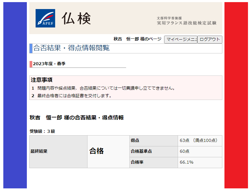 合格点が60点で、得点が63点なのでぎりぎりでした。まぁ、合格は合格。