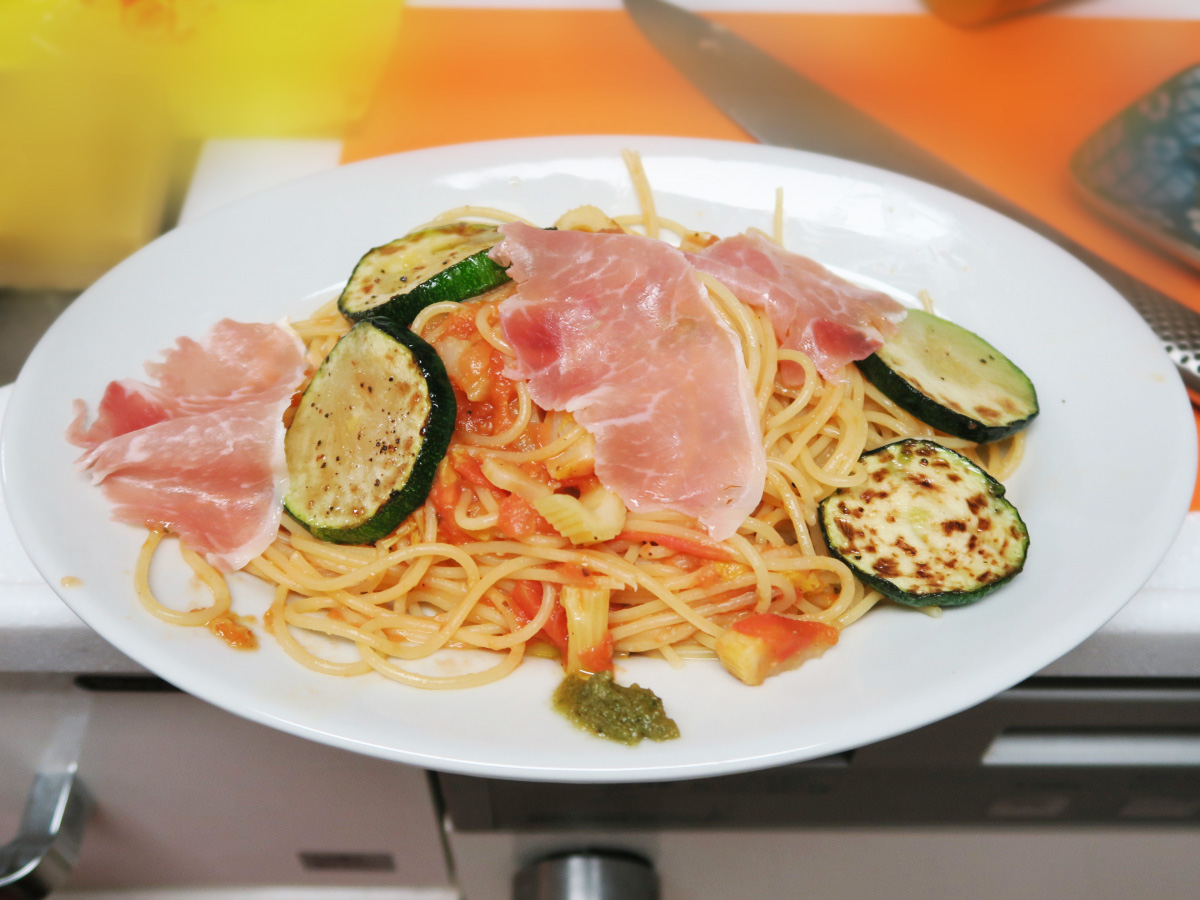 200422_冷蔵庫のものでトマトベースパスタ