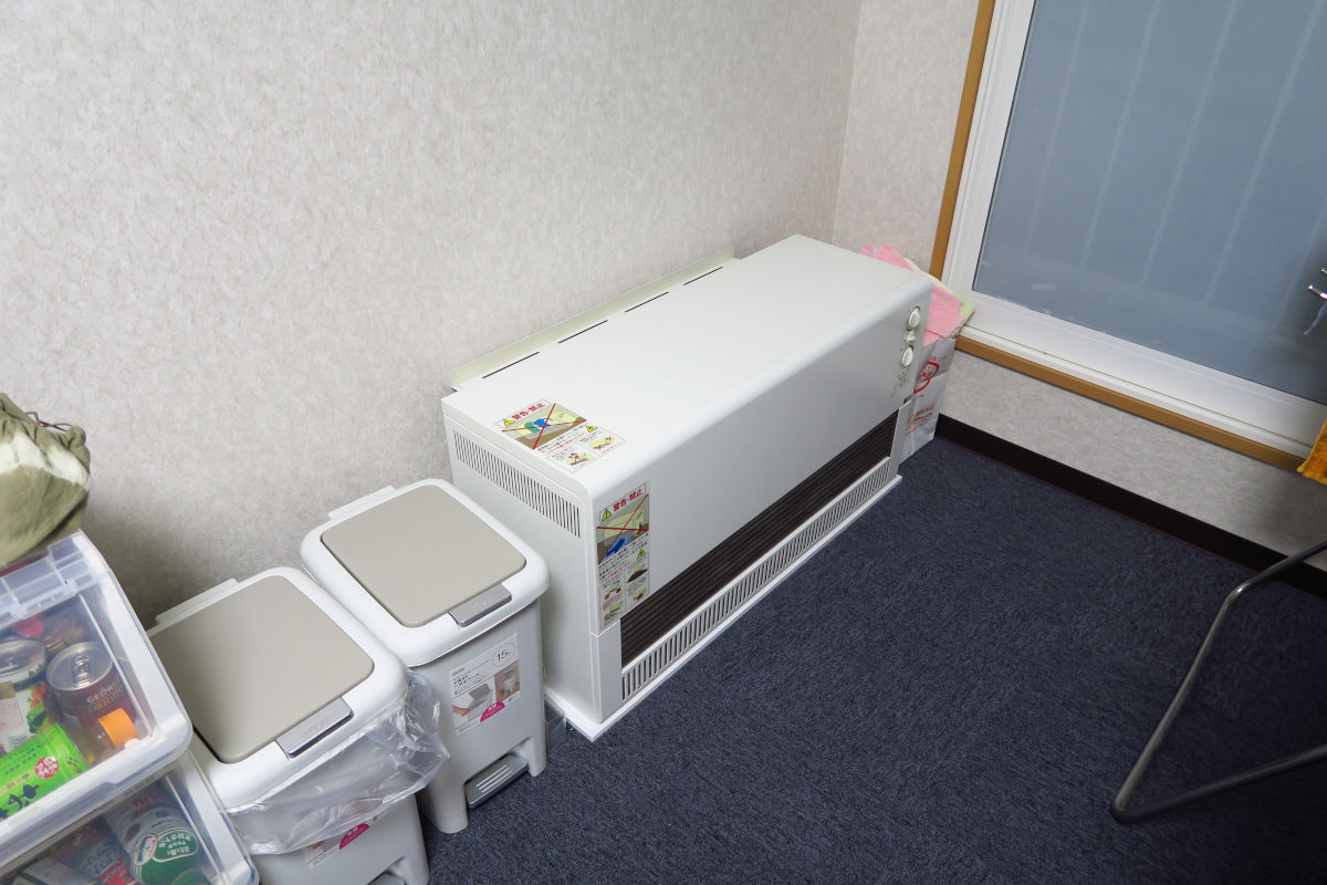 蓄熱式ストーブ、分別用のごみ箱。北見は「燃やすごみ=週二回」「容器類=週一回」が基本