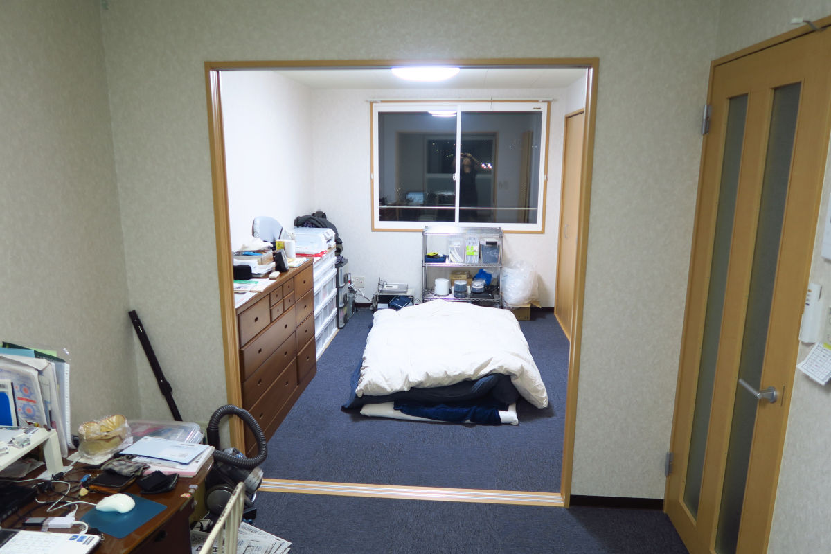 リビングから寝室を望む。扉は片づけた。けっこう広々。整理たんすはモノがかたづくねえ。