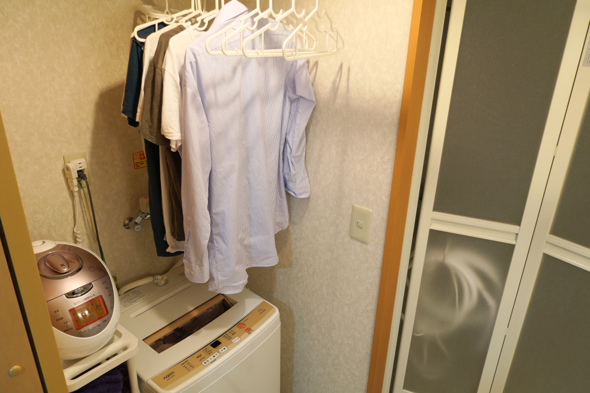 洗濯機、左に見えるのが、ワゴン。ちゃんと寸法測ってニトリで購入。サイズぴったりは使い良い。