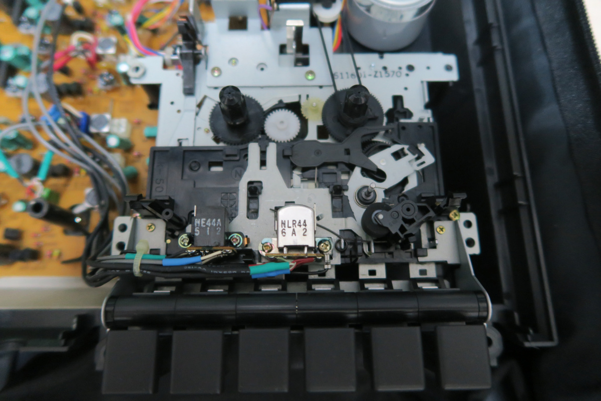 電源は入るものの再生、早送り、巻戻しができず。ベルトがだめなんだろうなと思いつつ開けてみたところやっぱり。キャプスタン用のベルトがゆるゆるで、走行系のベルトは切れていました。こんな古い機種の修理は自分でやるしかありません。