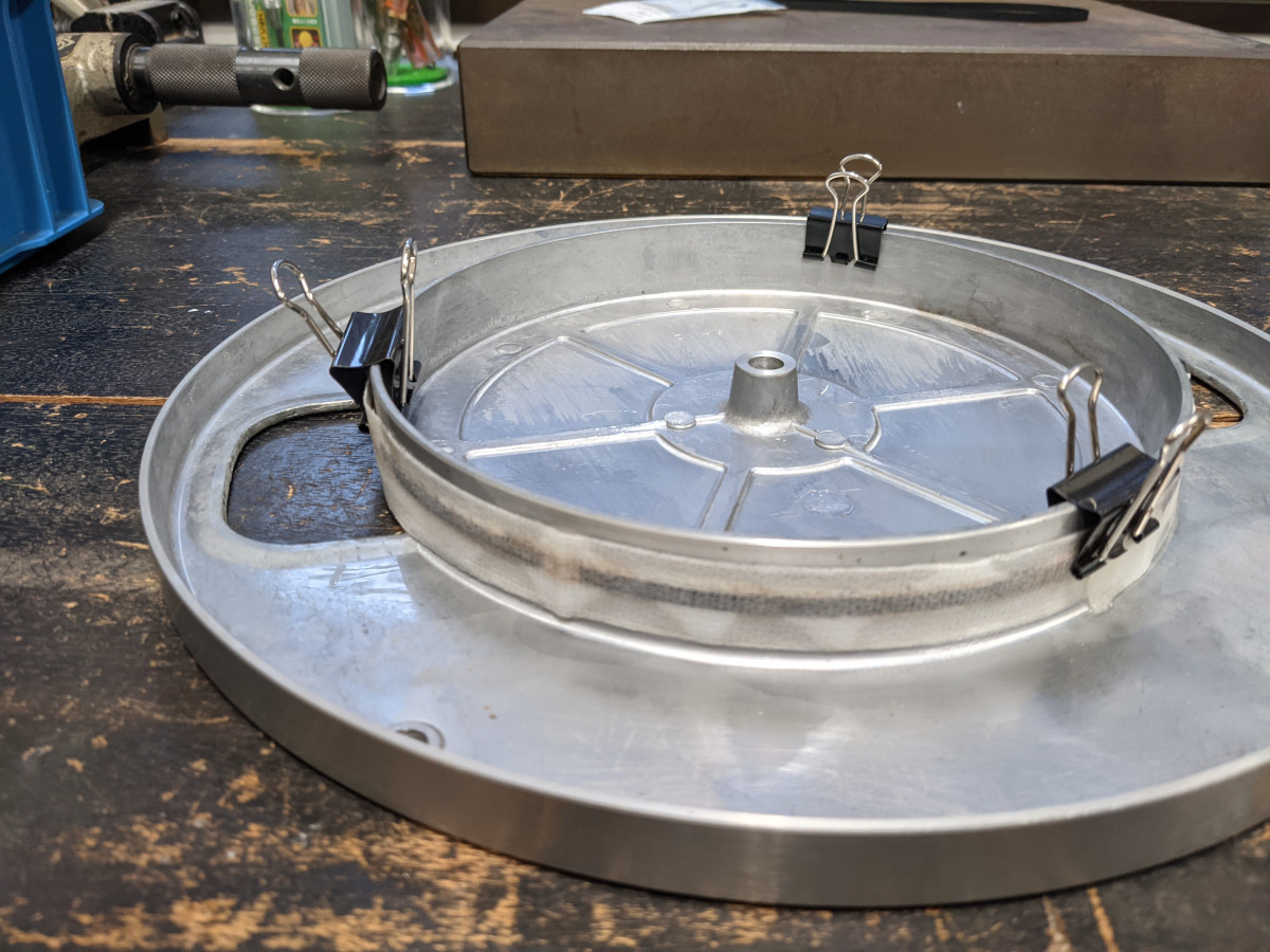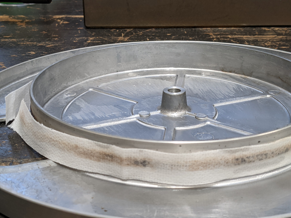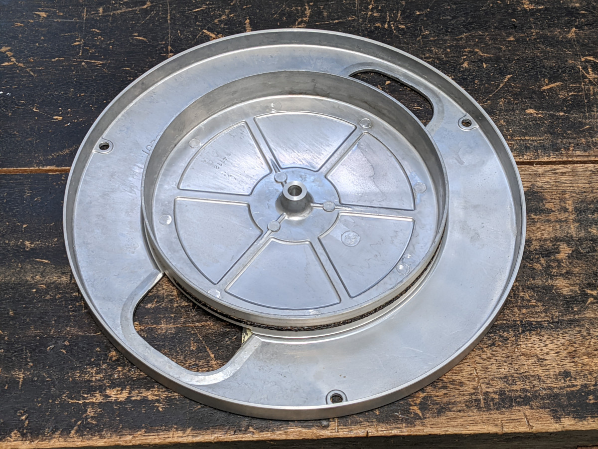 ターンテーブルのベルトが固着していました。まずはアルコールとソルミックスでしばらく漬け込んで軟化処理。その後ヘラで除去。しかしベルトの硫黄成分?がアルミを侵したのか?ダイキャストがぼこぼこでぶつぶつ状の凹凸ありだった。そのままでも一応回転はしそうだったが、せっかく買ったベルトが傷みそうなこと、凹凸がワウフラッターに影響(悪化方向)するのではないかと思い、やすり+水ペーパーで研磨して滑らかに。
