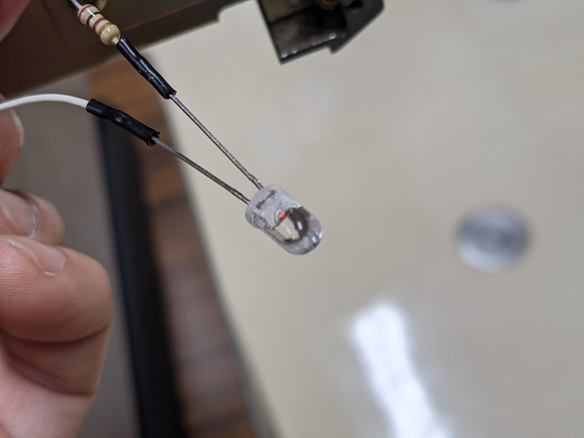 LEDのVfは1.7Vくらいとし12mA程度流しています。制限抵抗は100オーム。結果として半波整流なのでよく見るとフリッカーが出てますが問題ないレベル。