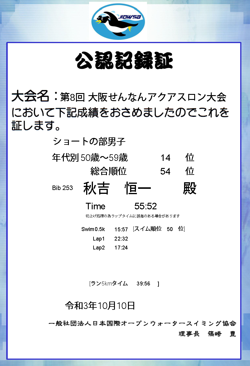 2021年10月 スイム 500m 15:57 ラン 5km 39:56 合計 55:52