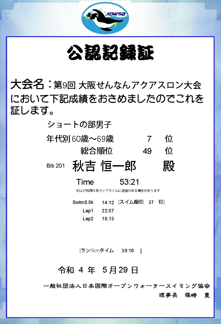 2022年5月29日 第9回大阪せんなんアクアスロン大会 速報