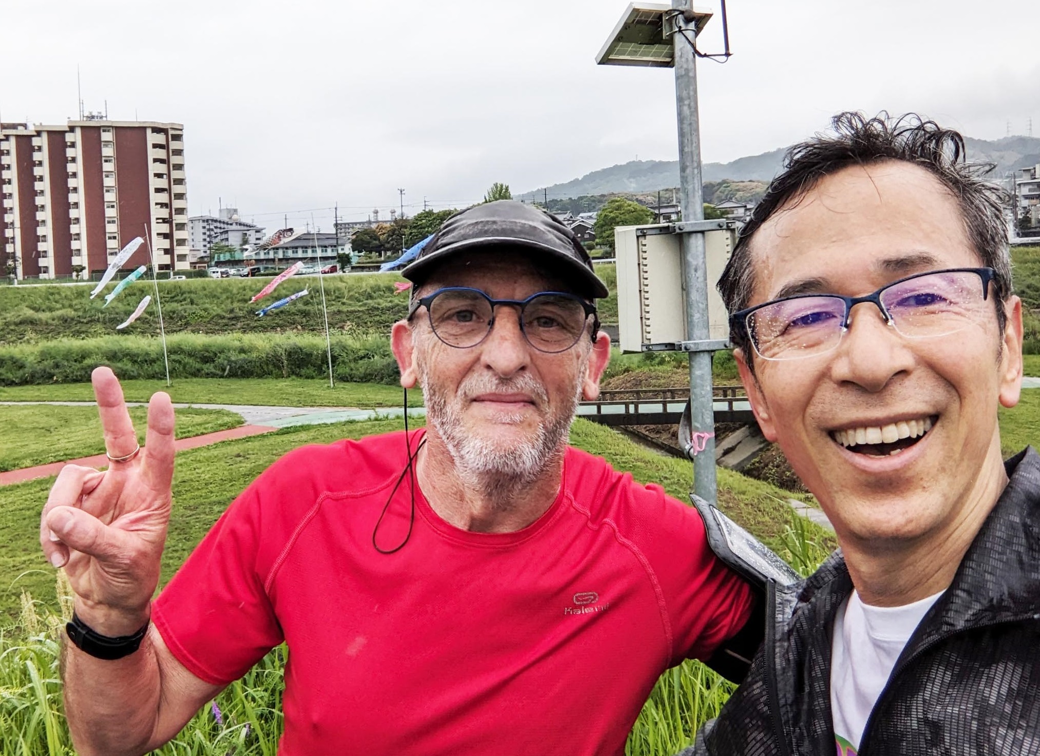 5月 フランス ブルゴーニュよりYvesさん、Martineさん来日。Yvesと大和川ジョギング