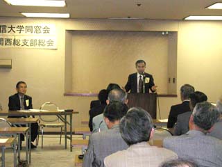 | 総会では野々村総支部長の会務報告を了承。梶谷学長から、副学長2名の配置や臨時増加定員の解消、大学内のIT化や国際交流についての動き、昨年10月の80周年記念会館竣工が紹介された。前田会長からは会の財政基盤の確立やベンチャー講座を実施したことが紹介され、出席者一同意を強くした。 |