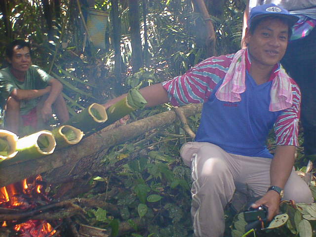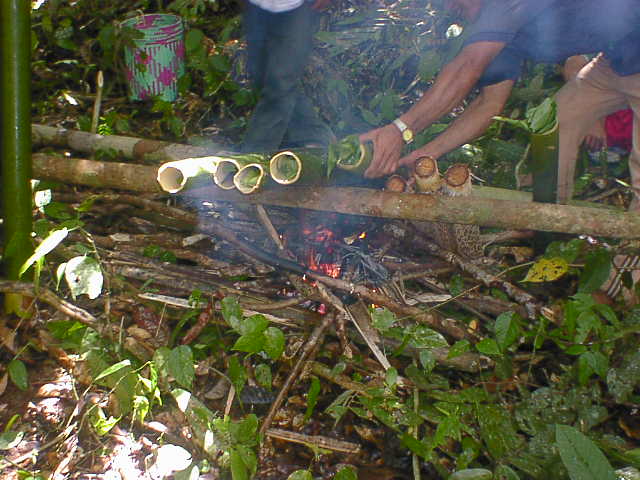 竹筒に葉っぱでくるんだ米を入れて炊く